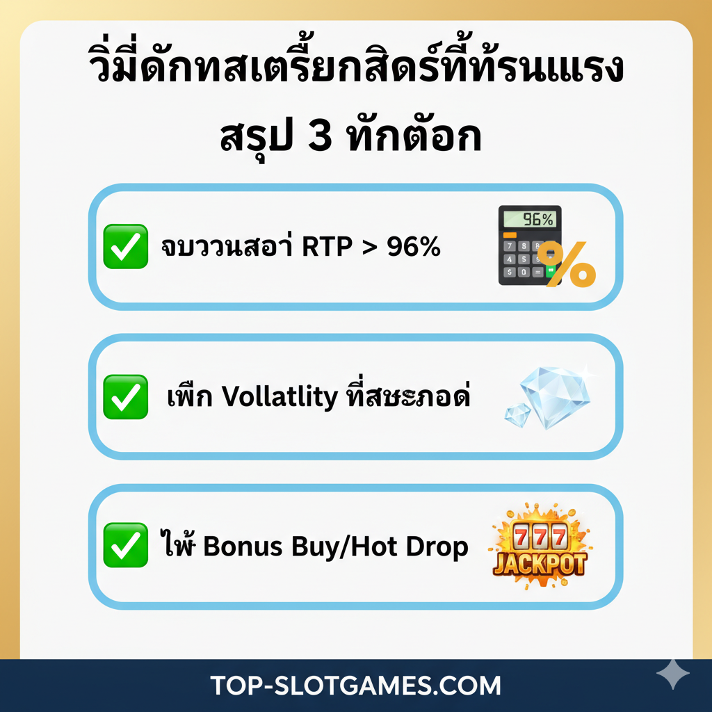 96%',配上一个计算器或百分比符号。第二步:'✅ เลือก Volatility ที่เหมาะสม',配上一个小/大钻石符号。第三步:'✅ ใช้ Bonus Buy/Hot Drop',配上一个即时爆炸的Jackpot符号。整个图片应采用泰语并使用粗体、易读的字体,背景是浅色的(如白色或亮金色),让信息一目了ียน,作为文章末尾的行动指南。”>